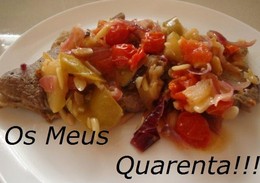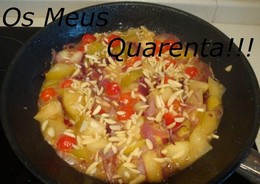 § Juntar à maçã, a cebola cortada em meias luas, os tomates cereja cortados ao meio e as amêndoas palitadas. Envolver com os sucos da frigideira e a maçã já meia cozinhada. Polvilhar com algumas gotas de vinagre balsâmico e saltear em lume médio por 5 minutos;