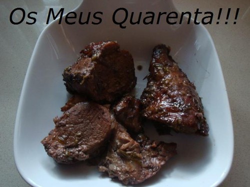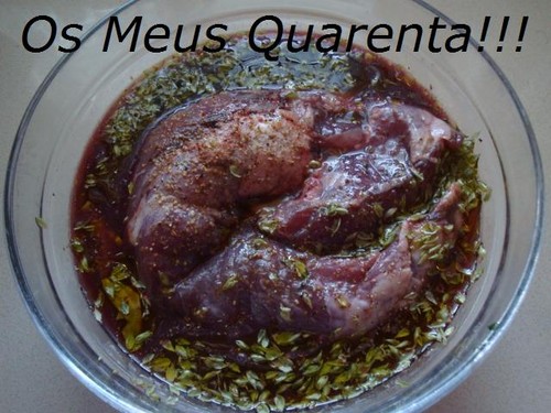 § No momento de se fazer a carne, pôr a carne numa assadeira e levar ao forno a 200º até ficar douradinha. Eu não reguei a carne com a marinada toda, fui regando aos poucos. A carne escurece um pouco na confecção devido ao vinho tinto, mas fica saborosa. Lá isso fica.