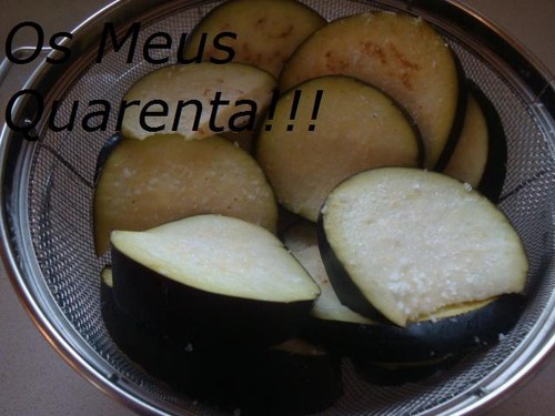 § Entretanto lavar a beringela, cortar as extremidades, mas não descascar, fatiar às rodelas médias e polvilhar com sal grosso. Deixar em repouso num coador as fatias por 15 min a 30 min, isto para libertar o amargo típico da beringela. A beringela liberta água. Para retirar o excesso de água, ainda costumo enxugar as fatias a papel absorvente. Reservar;