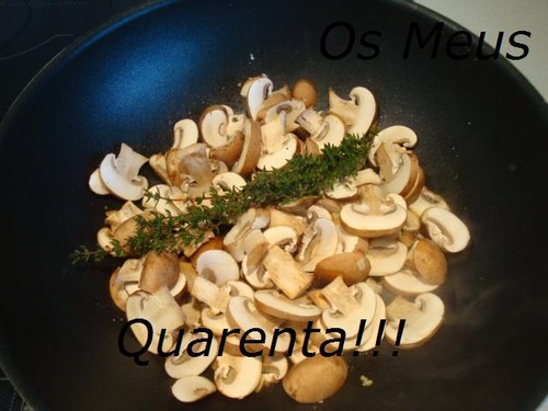 § Quando os dentes de alho ficarem louros, juntar os cogumelos (em lume alto), a haste do tomilho e polvilhar com o sal. Mexer;